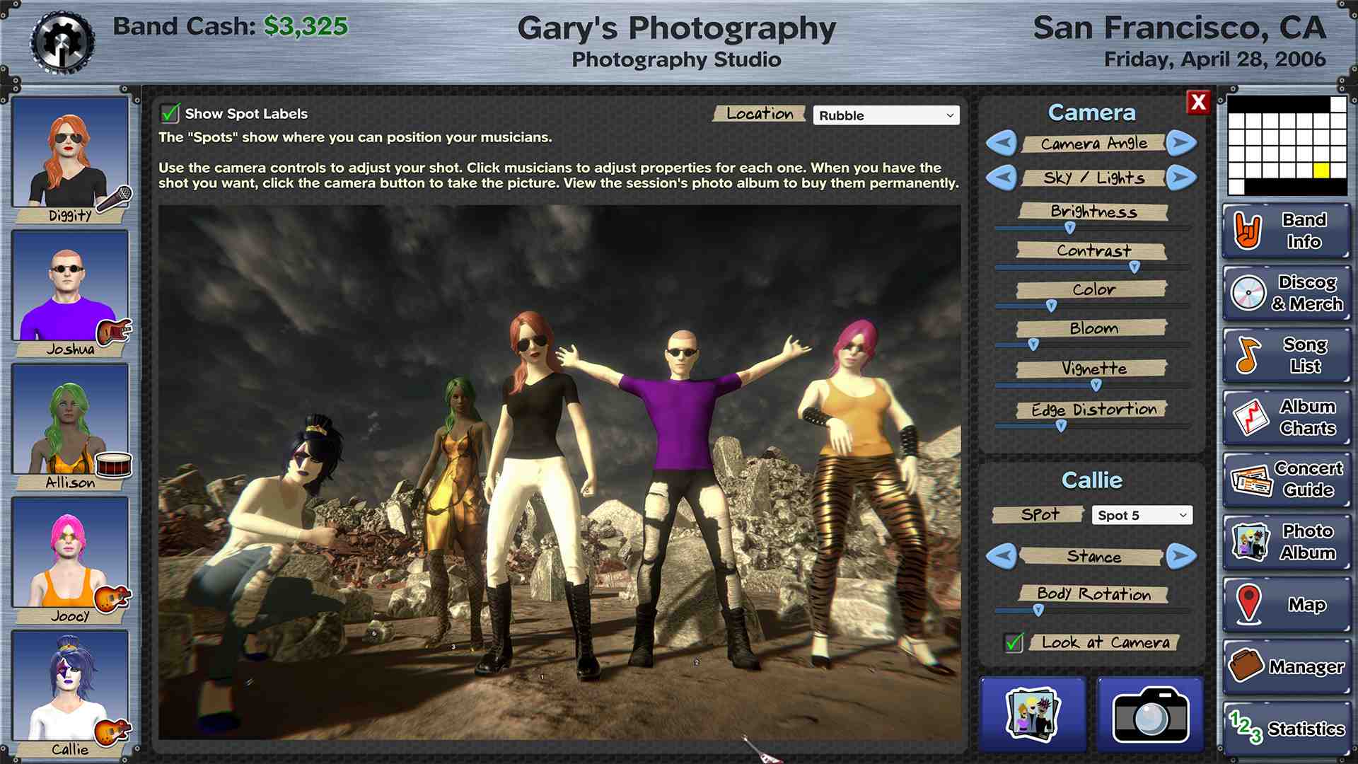 Explore a musical open-world environment. Find other musicians to form a band. Hire managers to find recording contracts, endorsements, book individual gigs or entire tours. Fully customize your band’s appearance and van with thousands of combinations of hairstyles, makeup, clothing and paint jobs. Purchase a variety of houses and apartments to call home, with hundreds of customization options. Live the classic rockstar life by trashing hotels & motels for inspiration and fun. Choose from 600 different types of real equipment to see what works best for your band Booking venues and tours across more than 130 cities in the United States. Take on 40 side jobs to earn cash while working your way up to stardom. Explores thousands of locations including bars, theaters, stadiums, clothing stores, recording studios, photography studios, hotels, art galleries, print shops, parks, cemeteries, and more.