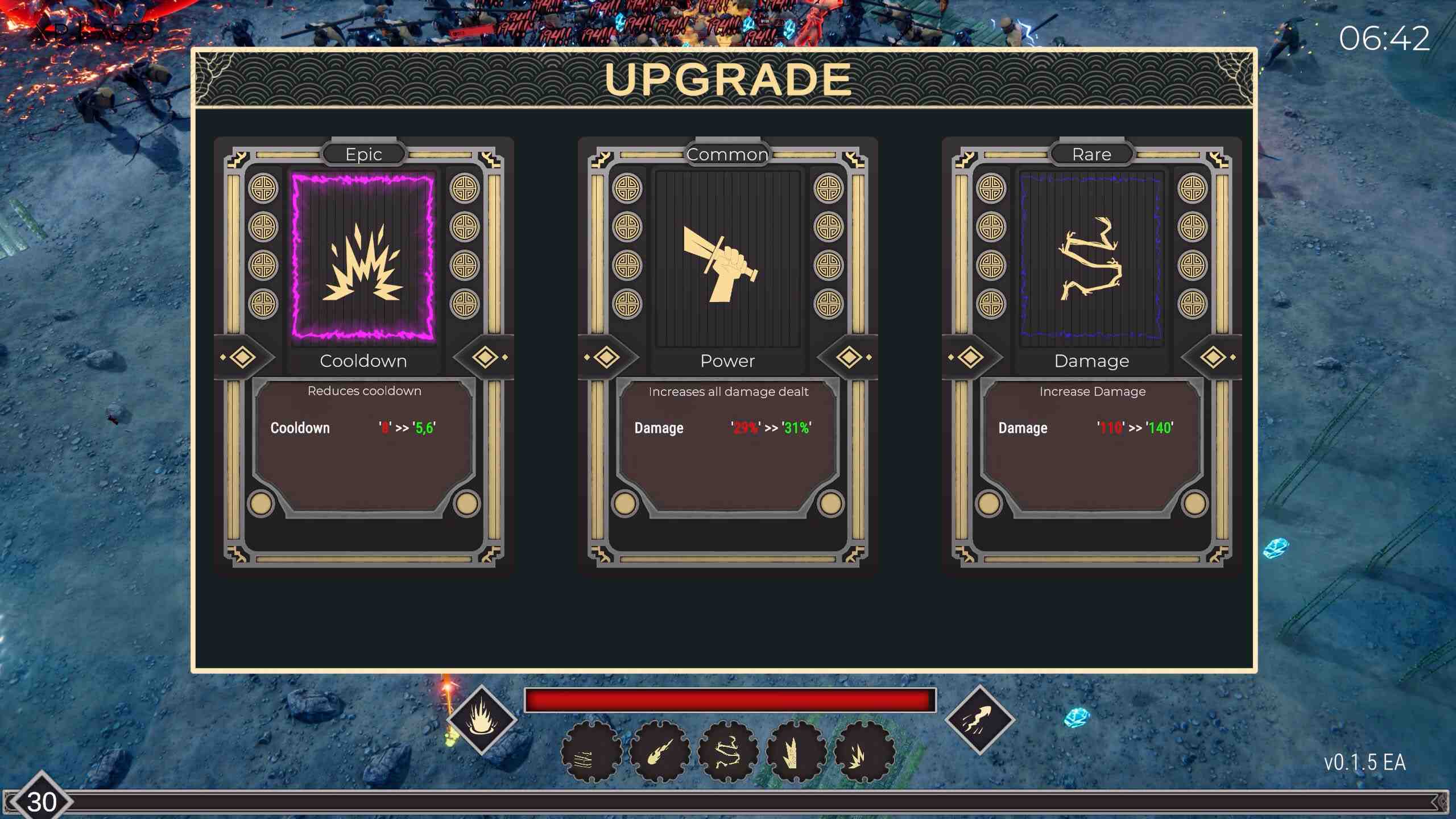 If you’ve played any Vampire Survivors style game in the last few years, Rogue Samurai will feel pretty familiar. You start with a Katana and later you’ll unlock a Bow and Naginata you can use. It doesn’t take long, but your experience is the currency for the new weapon, weapon upgrades, skills, and passives. So you’ll have to get your priorities in order before you start I guess. Gameplay wise it’s the traditional you’re a mobile tower in a tower defense situation. Walk around, dodge, use skills, kill enemies, collect gems/experience, upgrade, repeat.