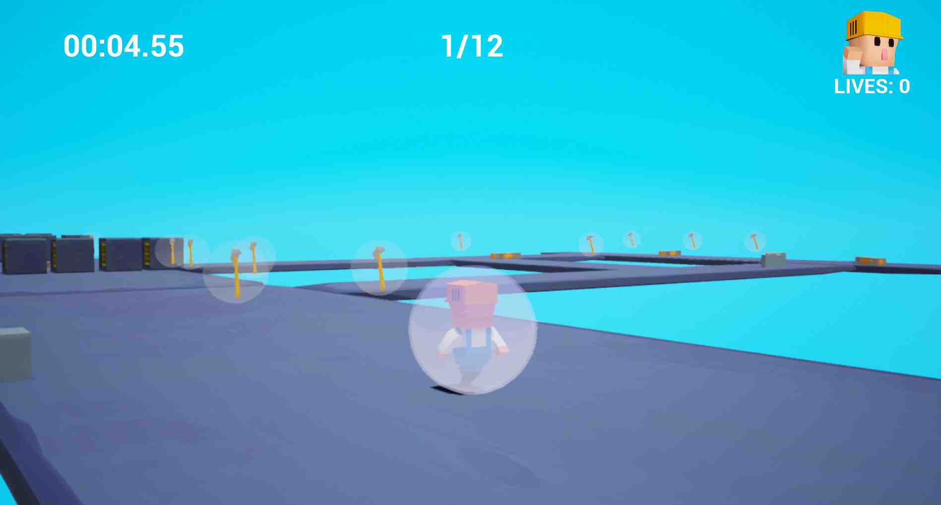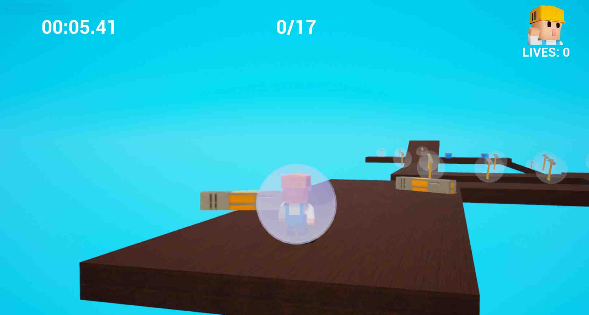 Player are Toolman inside ball in this roller ball game. Every level player mission is to reach goal as fast as can. There are difficult controls and obstacles like rotating cube and pushing platform which can push player out of map and then player will die. Collect hammers every level, by collecting 20 hammers player get an extra life. Every level end there are saw which gives player steam achievement. Game can be played in single mode where player can play any level he wants. In story mode player starts from level 1 and have 3 lifes and can get more by collecting hammers. Story mode player can play every 20 levels in row but if player loses every lifes he need start game from level 1 again. Single mode is for those who wants just play levels randomly and story mode for hardcore gamers. So be the most coolest Toolman and finish all 20 levels