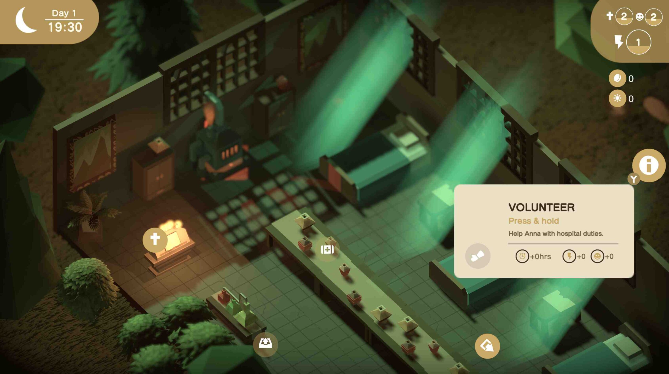 You play as a postulant, and your job each day is to carefully balance your time between activities that net you either Charitable Points (CP) or Faith Points (FP). Provisions are provided daily that you can acquire and upgrade to help your strategy over the course of your adventure. FP is obtained by praying at any building, or attending to spiritual activities at the Convent. Gather enough FP to unlock stained glass windows of the Saints, with special artwork and biographies of the heroes of the faith! CP is obtained by helping with building construction, delivering resources to buildings, and volunteering to teach, play with kids at the orphanage, or even deliver babies at the hospital. Save enough money to upgrade buildings, which lets you perform the activities at a quicker pace (time management is key).