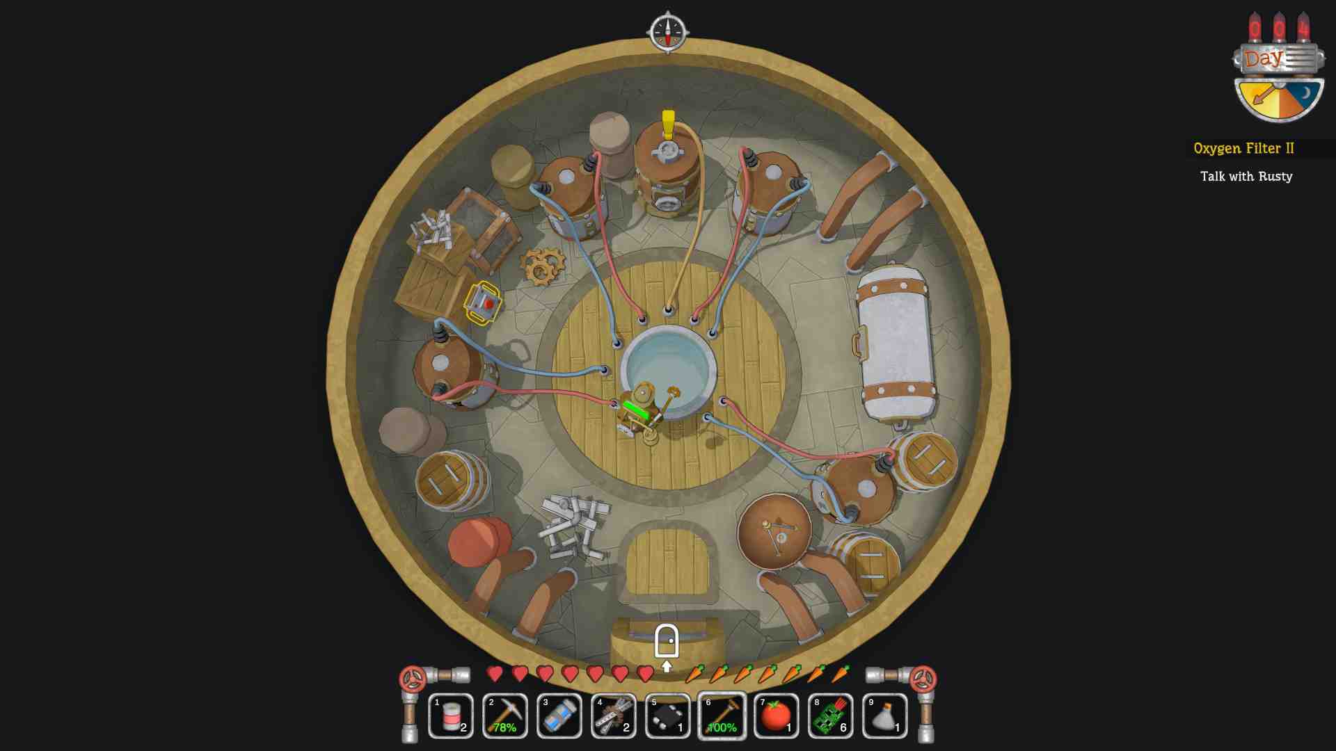 You will be able to change the game mode to online cooperation, even if you start in single player mode. In Scrapnaut players take the role of a stranded survivor crashed on an unknown, bleak planet populated by murderous machines. After meeting an unlikely ally, the protagonist will engage in a series of dangerous quests; building, scavenging and fighting his way through the wasteland, with leaving the planet as final objective. Catapulted into a hostile territory, the initial feeling for most players will be one of confusion and oppression, seeing their oxygen supplies dwindling for the poisonous atmosphere, with enemies all around. Luckily enough, not too far into the main story the re-commissioning of a vital oxygen generator will reduce this threat to zero for a while – this is the mechanism behind making each new zone livable, each time needing more and rarer parts. After that is sorted, some more laid-back exploration can be carried out, but always keeping an eye on the hunger gauge and health is recommended: notably, severe starvation instantly kills instead of depleting HP slowly as in most other games.