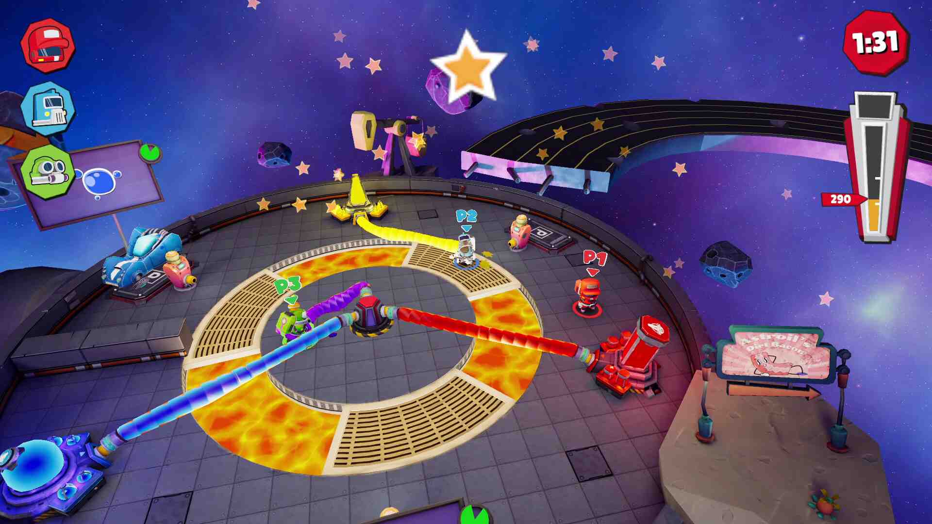 Astroil does not offer compensation for injuries related to employee mishaps. To pump these cars, you’ll need Astroil’s patent-pending pipe technology! These wobbly, physically-simulated pipes can bend and stretch to get fuel where you need it. They’re even partially lava-resistant (unlike the Servonauts)! Play in single-player with in-game support or grab your mates to jam it out as a duo, trio, or chaotic 4 player quartet. Work with your team and optimise your logistics as you aim to collect all three Gold Stars. Will this mean the Servonauts finally get a vacation? (Don’t be ridiculous…)