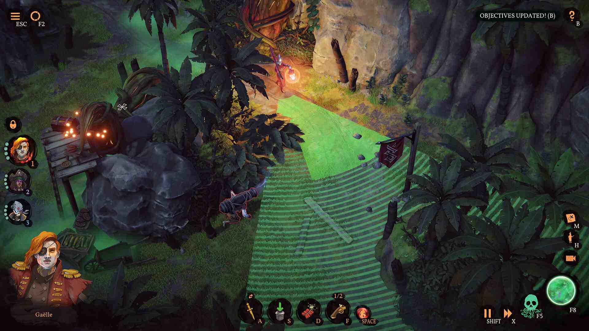 This is Shadow Gambit: The Cursed Crew, an all-new stealth strategy game set during an alternate history of the Golden Age of Piracy. The Curse of Lost Souls haunts the mysterious island chain known as the Lost Caribbean, which is under the control of the terrible forces of the Inquisition. They despise all that is supernatural and use soul devouring fire to hunt cursed pirates like you! Pull-off an epic heist and salvage a mysterious treasure of otherworldly power to defy the army of the Inquisition. Infiltrate their fortresses. Sneak behind enemy lines. Cleverly combine the magical skills of your crew to take out a variety of enemies with carefully considered tactics. Feel like a brilliant mastermind when your plan clicks perfectly into place! Embark on a journey with cursed pirate Afia and seek the legendary Black Pearls to revive a cursed crew of your own. Each of your eight shipmates is a playable character with an individual personality and armed with unique supernatural powers.