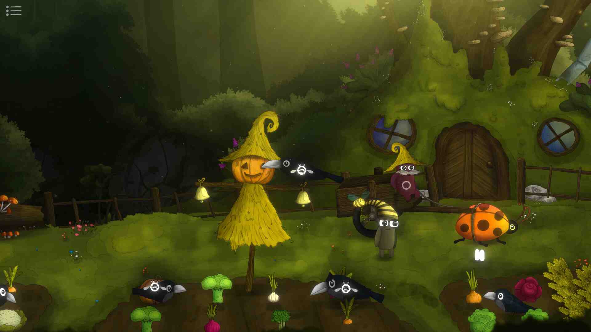 Because you won’t have to grab everything that isn’t nailed down, each scene has only a few hotspots. You can only move left and right, and hotspots appear in a large circle when you get close, making them difficult to miss. Some interactions include a friendly bee that flies about you. These hotspots have a unique icon. A minor quibble is that some hotspots become available only after you learn about them or need them to solve a problem. Items are used, but only in certain instances. You have no inventory, so you’ll grab an object, hold it in your hand, and utilize it in the same scene. The game focuses on simple logic puzzles similar to those seen in many other games. There’s a tile puzzle in which you must turn them to form a path, vegetables in various shapes that must be arranged in a box, cogs that must be inserted into holes to start a machine, and so on.