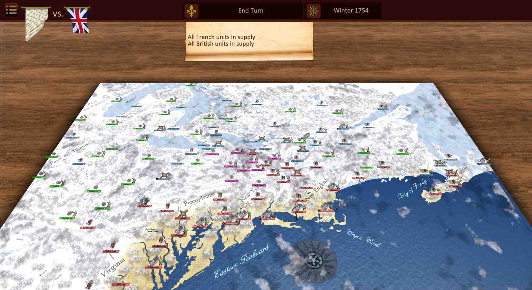 To win the game, the British must hold three of the French cities and towns of Louisbourg, Frontenac, Duquesne, Montreal and Quebec (and at least one must be Montreal or Quebec). If they don’t do this by 1760, the French win by default. The French can also win by holding the British cities of Albany and either New York, Boston or Philadelphia. This will be a tall order for the French but they can take comfort in the fact that the British, like NATO 250 years later have the watches, but the French have the time…