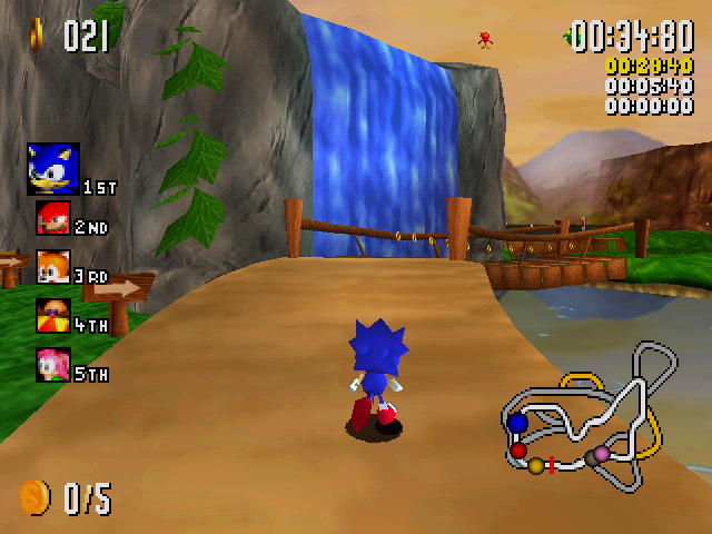 Sonic R’s gameplay is inspired by the Mario Kart series. But Sonic R focuses on jumps, hidden paths, alternative routes and shortcuts. Choosing one of ten heroes, you are invited to ride along 5 tracks: Resort Island, Radical City, Regal Ruin, Reactive Factory and Radiant Emerald. The task is to come to the finish line first. The multiplayer mode includes a Time Attack competition, where you need to overcome the track at a time. Get Balloon offers to collect 5 balloons at the location. Team Tag offers to arrange chases where you need to touch each other to pass the baton. On the tracks, you can collect improvements, such as increased speed, the ability to open doors for shrinking, invulnerability, etc. As you progress, new characters are unlocked: Dr. Eggman on Eggmobile, Metal Sonic, Tails Dollars, Metal Knuckles, Super Sonic and Egg-Robo, etc. Each character has its own unique characteristics.