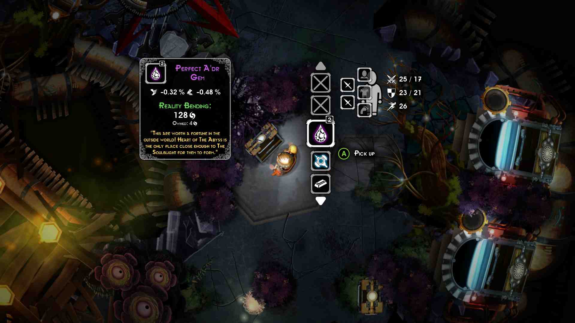 Soulblight does a lot of things that have been done many times before. It’s a top-down dungeon crawling action RPG with a stealth system. In many ways, it’s a lot like so many games before it. It has those familiar roguelike elements (or “roguelite” since it’s not actually like Rogue as a game), with the permadeath and procedural generation that form the pillars of the style. There’s some crafting and survival mechanics thrown in as well, which are pretty basic, but well-implemented (I’d prefer it if hunger was either slower to build or easier to satisfy, but that may get easier with practise). In general, all the game’s systems are well done. It’s got a sense of completeness that a lot of games seem to lack – even the aspects the game isn’t doing anything unique or special with feel solidly implemented.