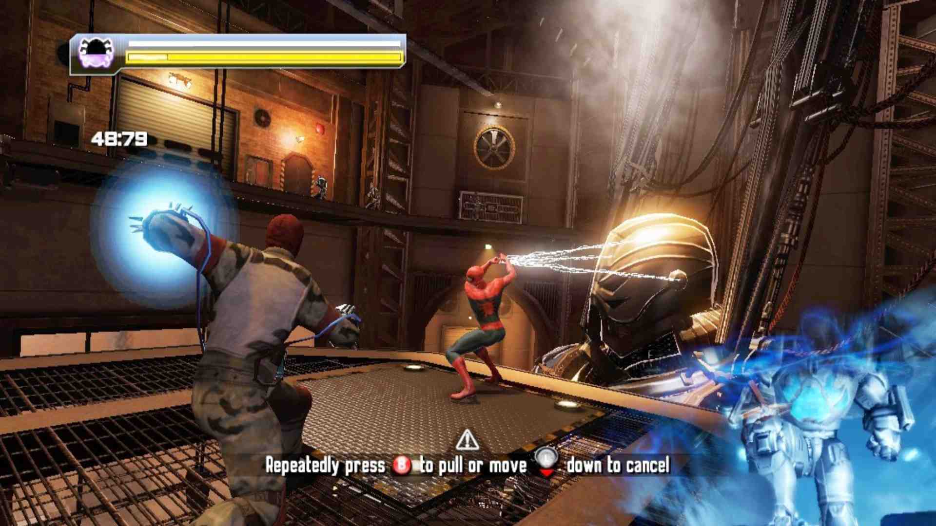 Unfortunately, although their personalities may contrast, playing as the two Spider-Men feels very similar. As both Parker and O’Hara, you unleash combos by rapidly pressing one button, launch enemies into the air with another, and fire web shots with a third. There’s some fun to be had in clobbering the thugs, robots, and mutants that try to put a stop to the Spideys, and using their super-speed abilities to attack enemies while those enemies continue to attack where you were standing an instant earlier is empowering. But although you unlock new moves and power up existing ones throughout the course of the game The combat doesn’t evolve in any meaningful way. It never requires much skill, so defeating your enemies doesn’t remain rewarding. It also doesn’t look great. Spider-Man should look stylish as he’s putting the hurt on the bad guys, but Edge of Time goes overboard with the flashy effects.