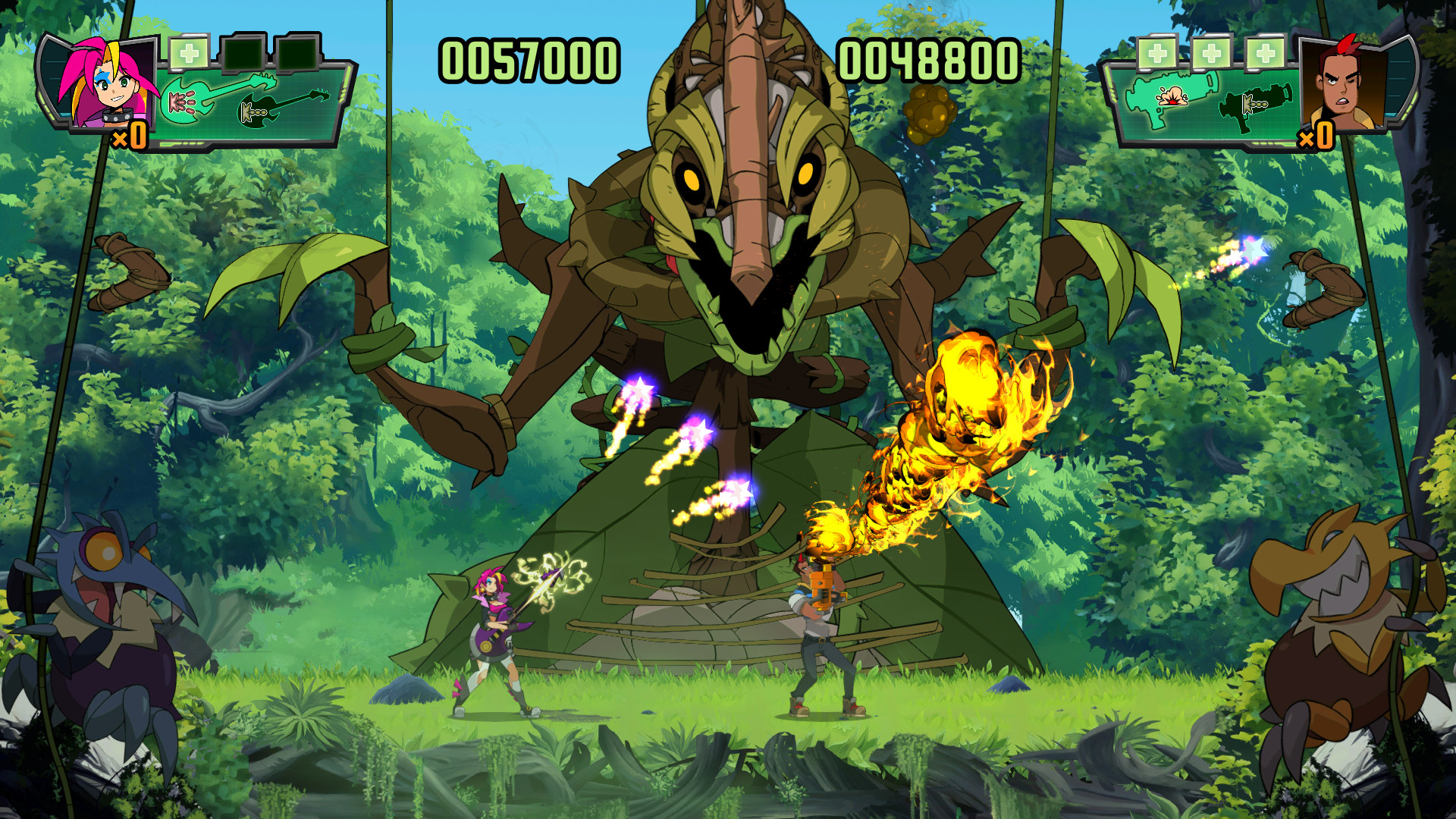 Alert! Alert! The nightmarish dinosaur-spider hybrids known as Spidersaurs have run amok and only you (and a friend in co-op mode) can stop them! Created by InGest Corp to provide the meat and muscle that humanity needs to end world hunger, the Spidersaurs are now on the loose, leaving it to two former taste-testers – officer-in-training Adrian and punk-rocker Victoria – to use their awesome firepower to overcome six stages of ferocious run-‘n’-gun action. Blast through a sweltering jungle, an infested laboratory, the heart of a live volcano, and more! The tangy food source with a bite is biting back, but by grabbing power-ups, gaining new abilities, and obliterating everything in sight, you can send these mutant monstrosities back to the stone age. Intense, Saturday-morning-cartoon-style action for one or two players — complete with theme song and epic intro from Powerhouse Animation! Two distinct playable characters: punk rocker Victoria and officer-in-training Adrian! Unleash awesome firepower — everything from spread guns and lasers to detonating footballs and bass-heavy electronica! Twelve weapons in all! Explosive environments including volcanoes, jungles, laboratories, and more! A menagerie of unique and terrifying Spidersaurs to battle! Unlock new abilities as you advance through the InGest Corp facility!