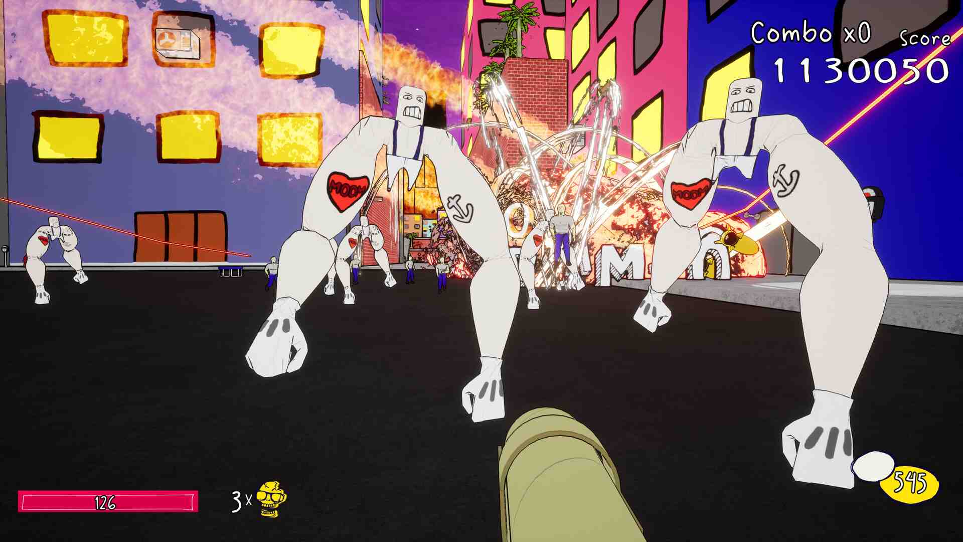Super Buff HD is a fast-paced skate-surf-FPS. The year is 202020. It’s wild. All the buff dudes have turned on society. STOP THEM MOBILITY TO MAKE YOU FEEL SUPER POWERED: Levels are playgrounds you can jump, shred, and bounce all over. Grind between rails. Body-surf on enemies. Use water jets, trampolines, poop fountains and pretty much anything to launch yourself heavenwards for huge air. MIGHTY WEAPONS TO KEEP THE BUFF AT BAY: Choose from a modest armory of killy toys, each with dual firing modes and unique functionality. From a trusty hammer that always makes its way back to you no matter how far you throw it, to a revolving potato cannon with backup basketball bombs. A WORLD OF POOP AND PURE IMAGINATION: Your battle against the buff takes place across 18 stages of strangeness. Levels are variously and hilariously themed, such as mushroom, street, cowboy, moonbase, mall, and sewage (don’t fall in the brown stuff.