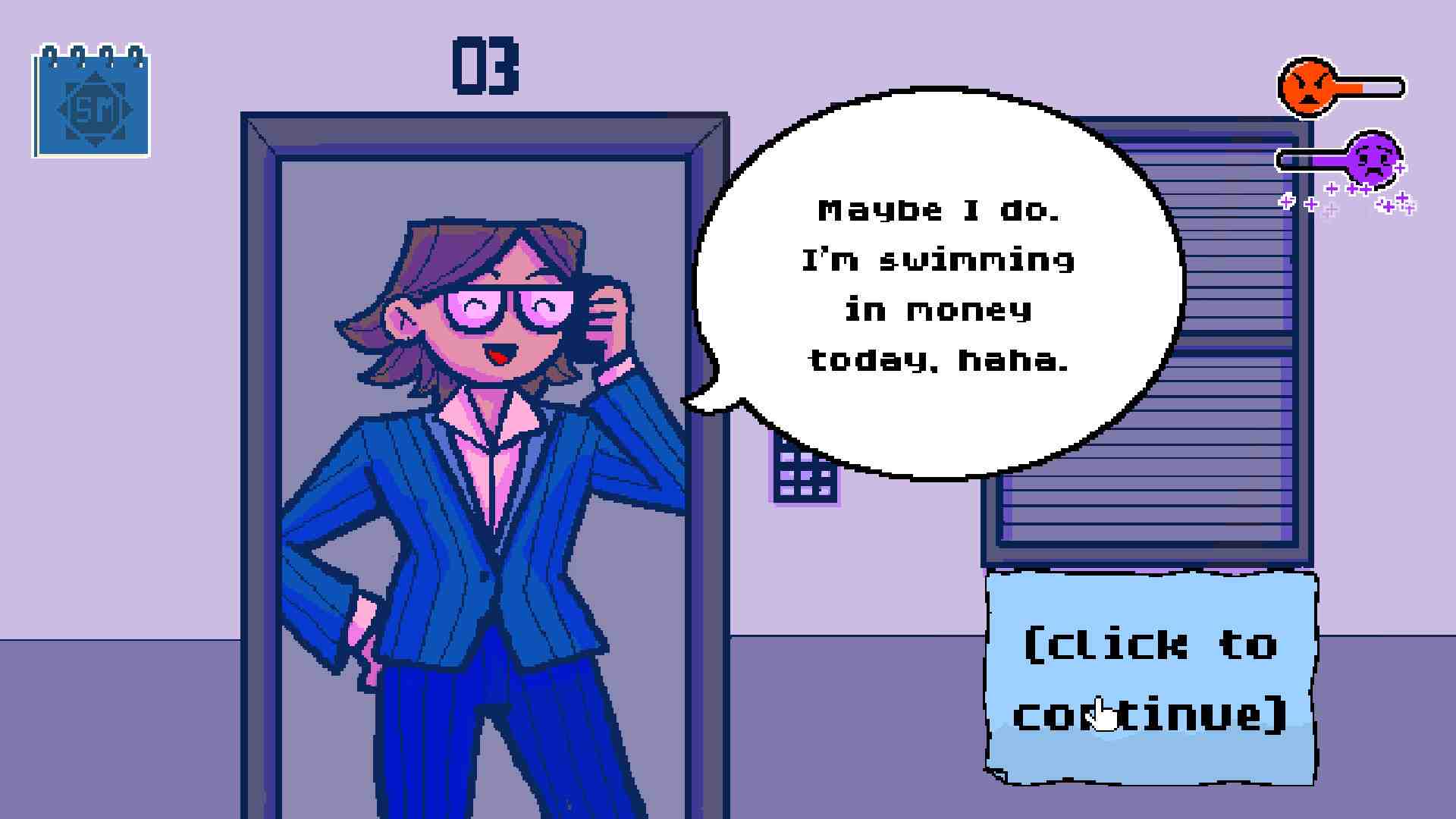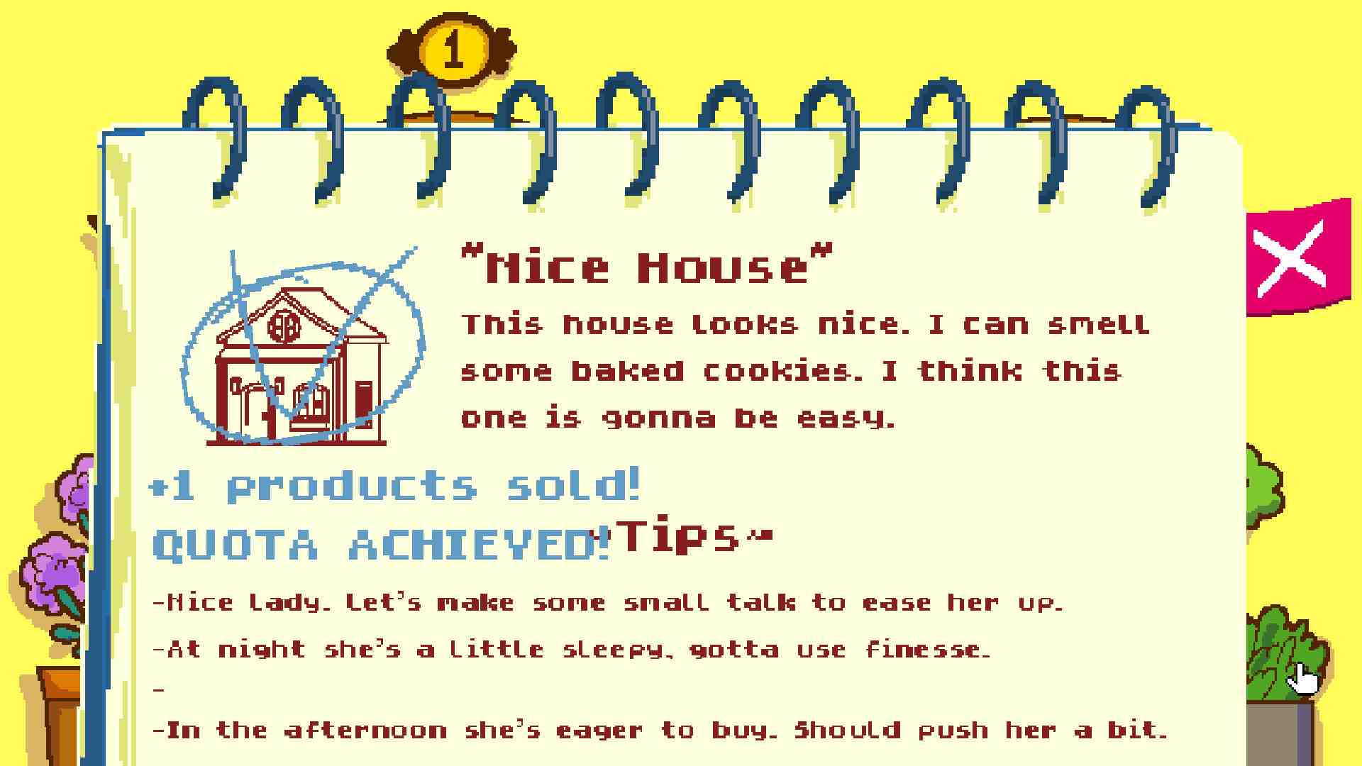 Work for Sunny Morning™ and sell products of the most varied natures! What kinds of products, you ask? Do not worry about it, your role is only to sell them. Each step of the conversation can increase or decrease your Rage, Depression and SALES! Choose carefully which house to visit at each time of the day: The mood of each potential buyer varies with time! Balance your spending between Motel daily costs and items that help you deal with Rage and Depression. It’s pretty interesting and the characters are all very unique in their own way. The game is basically you just going door-to-door selling products to strangers. You have a stress and depression meter which can go up pretty fast. Once you reach max of the stress, it’s game over! You have to be careful with your words with each customer, which can be difficult at times, but you learn from your mistakes and try different ways to approach them when starting the game over.