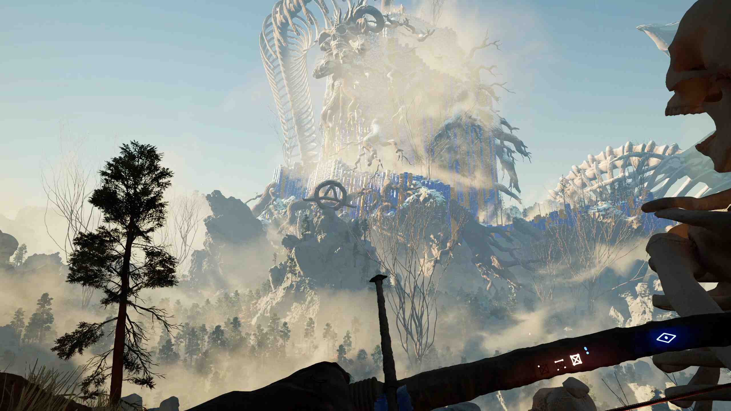 “The Axis Unseen is the most Skyrim-like game I’ve played since Skyrim… stripped back and filtered through the likes of Elden Ring and Praey for the Gods.” – The Escapist Hunt monsters from folklore. Follow their tracks and blood trails. Pay attention to the wind direction so they can’t smell you approaching. Almost all of the UI in the game exists in the world itself. You have to check your quiver to see how many arrows you have. Tattoos on your hand light up to show your health and active powers. Your bow shows how much energy you have collected from the creatures you have killed and how much sound you are making.