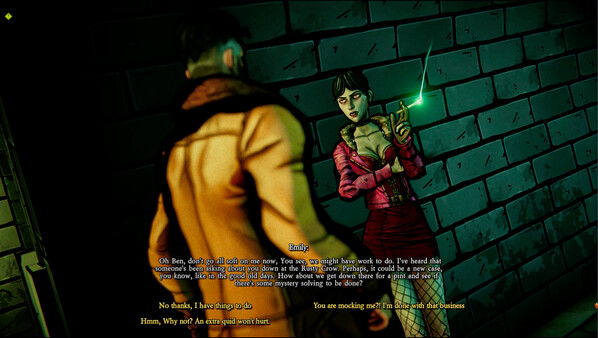 neutral option. It is a cool idea that I want to give it a chance and wouldn’t go so far as to give a negative review as I know how harmful negative steam reviews can be for new games and I have hope this game will get better. Chapter 1 is all that is available right now. I wasn’t rushing through and was taking my time. It took me not even an hour to complete chapter 1. That just feels really short to me. Are all chapters going to be this short? I honestly felt like I was playing a demo. In this 50 minutes of gameplay, I hardly did anything or experienced too much story. A good chunk of that time was walking through the city which was painfully slow until at the end I found out how to run. This reminds me heavily of TellTale games, especially Wolf Among Us, which is my favorite. The visual style is great, I enjoy the music and sounds.. The voice acting isn’t bad and I am interested in Emily. The writing does feel a bit awkward to me at times, almost a little robotic and inconsistent in flow.