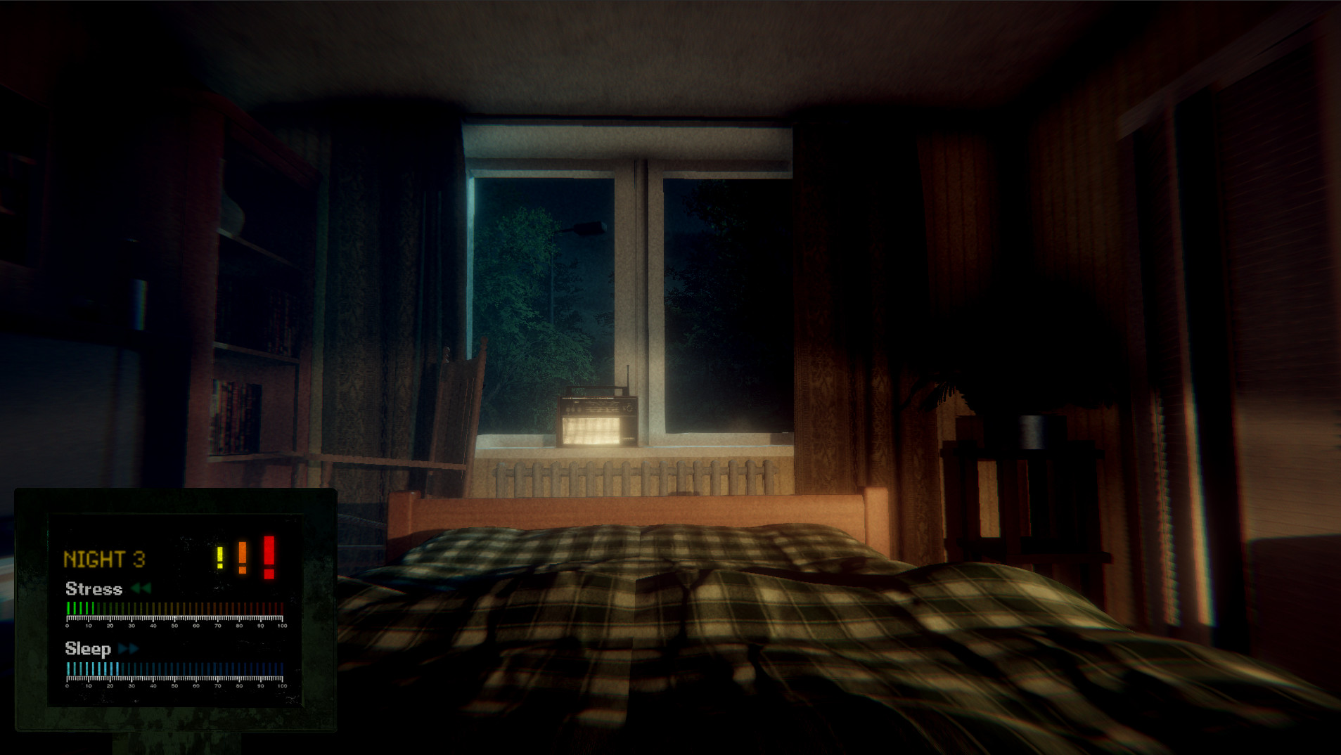 In the sleeping phase the player has to fall asleep before the clock reaches 4 am. There’s an info panel that displays the player’s current sleep and stress level. By closing eyes, the player can raise the sleep level and fall asleep once it has been filled up. The stress level will rise upon witnessing hallucinations. Sometimes the hallucinations can materialize as horrific monsters and if the player doesn’t hide under the blanket in time, they can cause a jumpscare and increase the stress level a lot. Keeping the eyes open and turning on the light will reduce the stress level. The key for this phase is to maintain a proper balance between the sleep and stress levels. In the dreaming phase the player gets to relive the events that led to John’s current, unfortunate condition. Compared to the sleeping phase, here the player can freely roam around and explore the environment. But be careful – a dream can quickly turn into a nightmare.