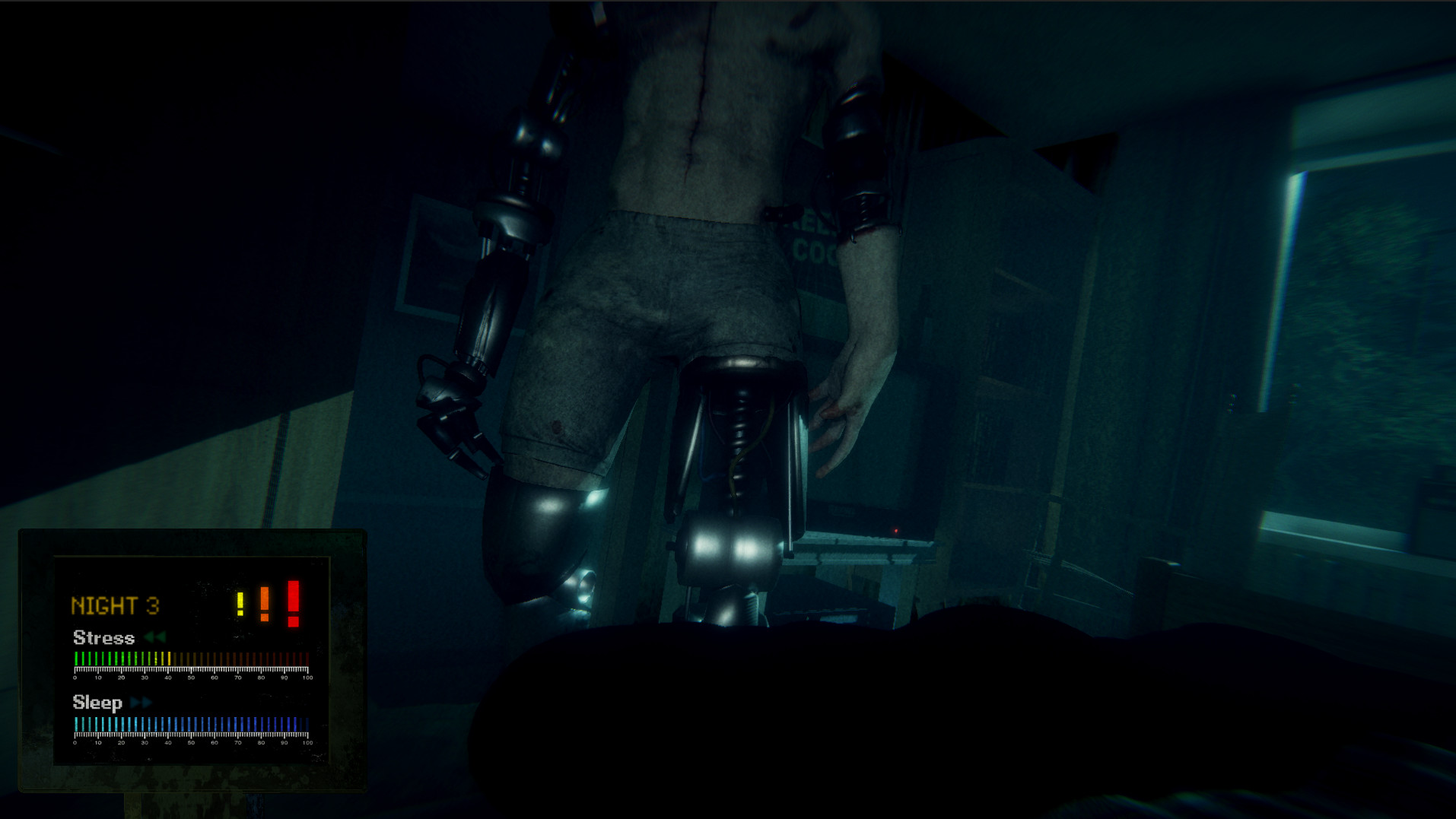 John Herrin survived a horrible accident and as a result, he damaged his brain and lost his memory. Only Dr. Rick Norberg and the friendly robot “AB” can help John to recover from his brain damage and restore his broken memory. By falling asleep and rediscovering the past in his dreams, John can restore his memory and remember what caused the unfortunate catastrophe in one of the most secretive laboratories of the “Revivel” company. But due to John’s brain damage, falling asleep won’t be as easy as it seems at first… John will start to hallucinate and hear sounds that will only make it harder to fall asleep. Only by dealing with his fears and staying calm can he successfully fall asleep, otherwise, his overwhelmingly high stress may lead to an untimely death … “Try to Fall Asleep” is a first person, action-adventure horror game where you try to survive through scary, harmful hallucinations in order to fall asleep and rediscover the main character’s past through his dreams. The game is divided into 6 nights (4 nights currently available). Each night consists of two phases – sleeping phase and dreaming phase.