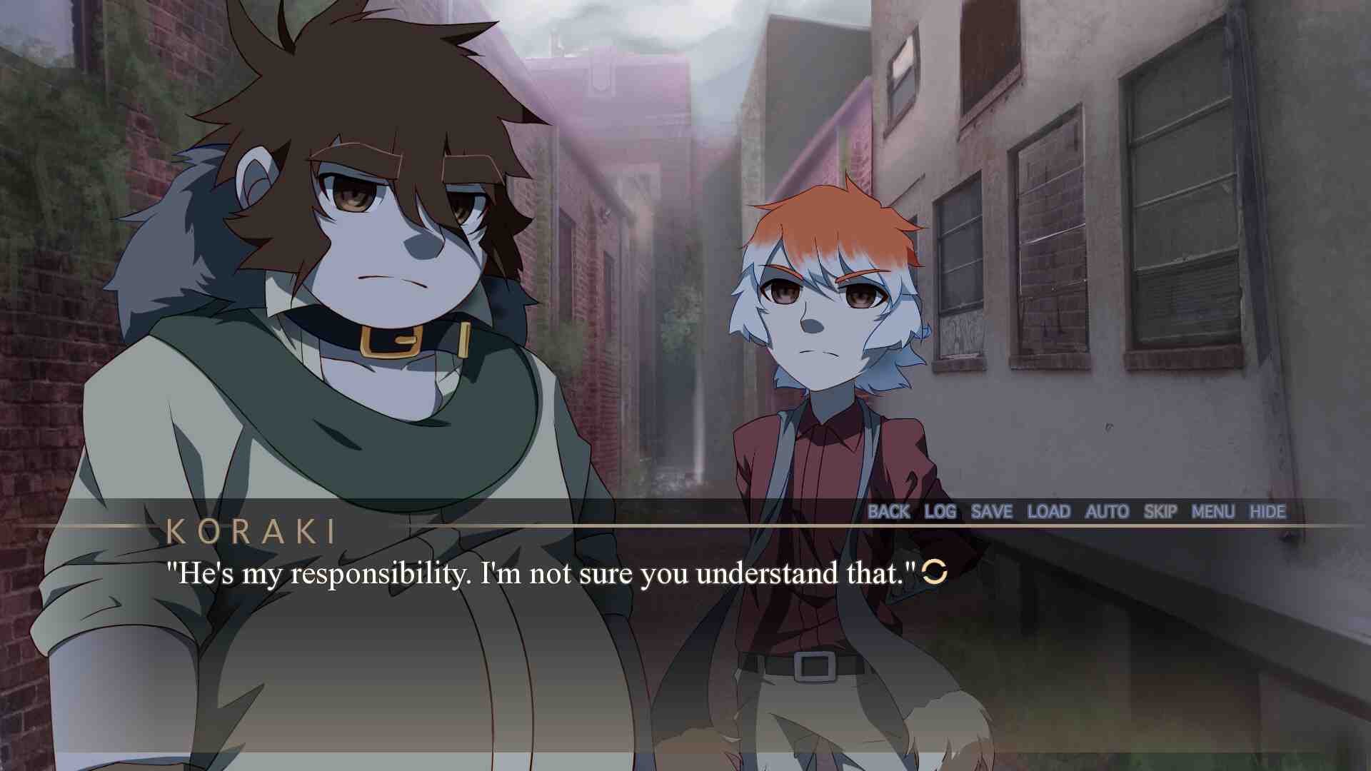 In the city of Enonoia, injustice and crime run only as rife as inequality and repression. Once leading a comfortable youth, Koraki Mavrosa learns firsthand that society is not as it appears. She is left to wander treacherous ground after her family is abducted by the authoritative force of the city: the Master Order Trained Hire. In Koraki’s interference, she discovers secret technology with which she causes a wild grizzly bear to transform into a man before her very eyes. With nothing left to lose, she harnesses the strength of the silent man she calls Arkuma, who unleashes his wild nature upon revealing he’s on no better terms with the police. The girl’s wish for peace and the beast’s disdain for her kind clash as they join forces to topple the institution that wronged them. Can these ideals persist and coexist, or will Koraki and Arkuma’s revolution spread even more corruption in its wake? An adventure-style visual novel.
