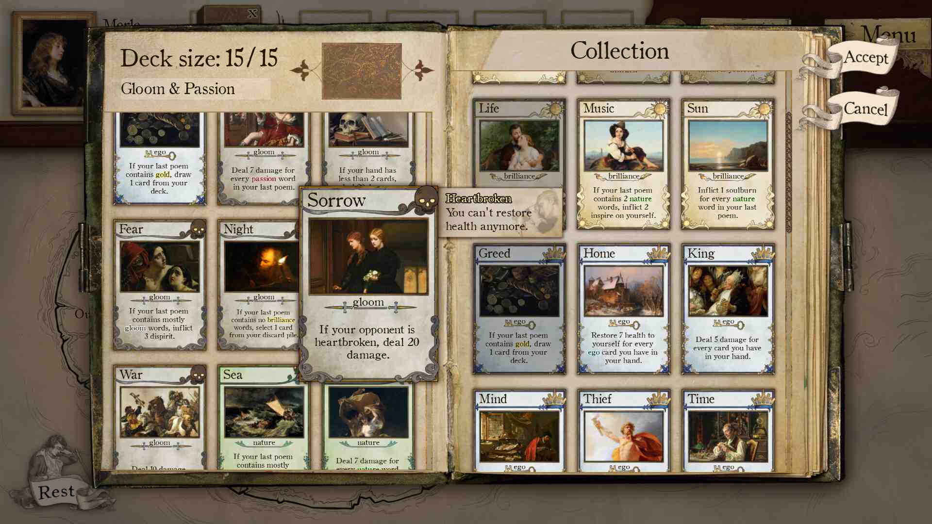 Verses of Enchantment is a deckbuilding card game set in an 18th century fantasy world. Travel the lands and learn magic in the form of cards from a cast of unique and diverse wizards. Become one of the greats as you weave together spells and poetry into Verses of Enchantment! Play cards against various opponents on your quest to become a fully fledged wizard. Collect new cards by winning duels to expand your spellcraft. Your played cards transform into poetry that can trigger various effects in newly played cards. Carefully think ahead to influence the generated poetry and become a master in strategic prose. Learn about the 5 different schools of magic dictating the world of Verses of Enchantment. Compose your deck of cards to inspire poetry to be remembered through the ages!