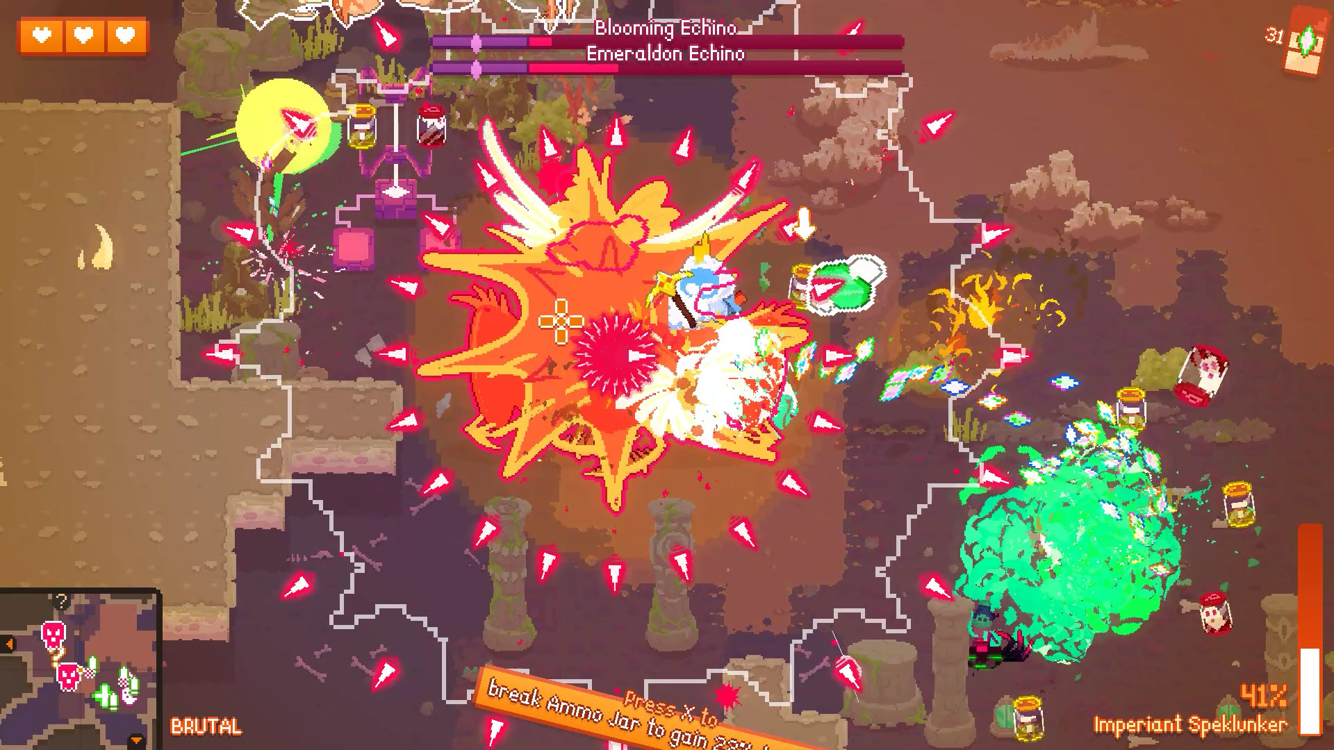 Voidigo is a chaotic and colorful roguelite shooter with a focus on dynamic boss fights. Or use one of the melee weapons if you prefer a more personal approach. After about three and a half hours, I’ve beaten my first run of Voidigo. But like all good roguelites, that is not the real end. At its core Voidigo is a pretty standard roguelite, but there are some differences. The first is that bosses are not locked to a boss room. Instead, they wander around the map with their health bar locked until you kill off the crystal scattered around the floor that protect them. Each crystal makes a portion of there health bar damageable. Additionally, this game has a jump mechanic where you can jump on enemies’ heads to stun them for a bit. Something I find interesting is that you do not need to kill all the enemies to progress to the next room. Simply smashing the crystal will unlock the door.