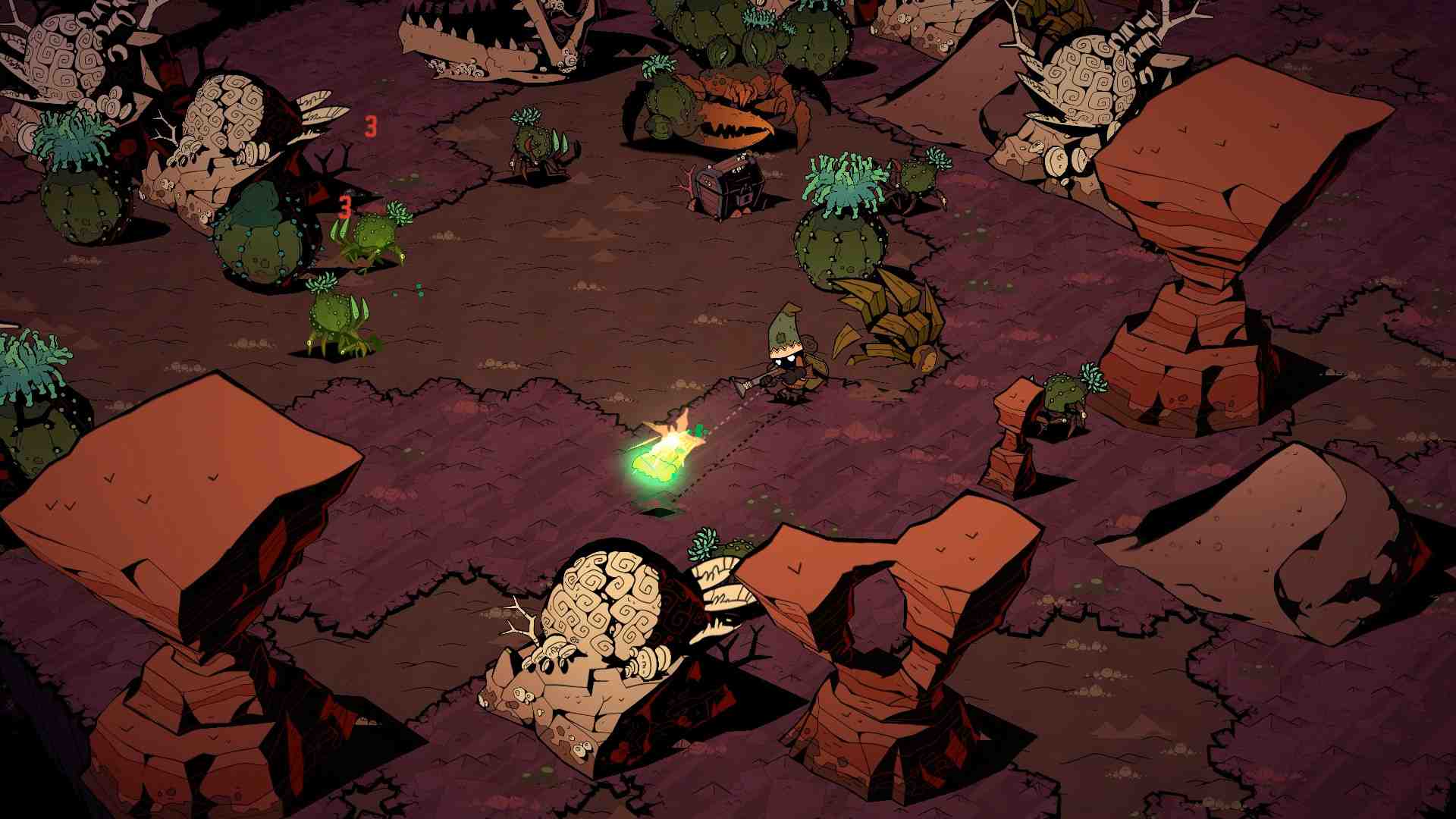 The creature part is very unique! The dance battles are executed via deck battles like Slay the Spire. When you win, you get an Ooblet seed which then can grow into a new friend! Your Ooblets follow you around like in Heartgold/Soulsilver, but you can also leave a few at the farm to help you take care of your crops. One of the cons is that the game doesn’t let you talk with your following Ooblets or let you feed them treats, which I would’ve liked to see. There is an incentive to collect many different types to allow for synergy with your chosen dance troupe; some Ooblet dance moves work best with others. Explore and uncover new sections of the world filled with deserts, swamps, tundra, and prairies – all loosely floating together through space and time after the world was fractured.