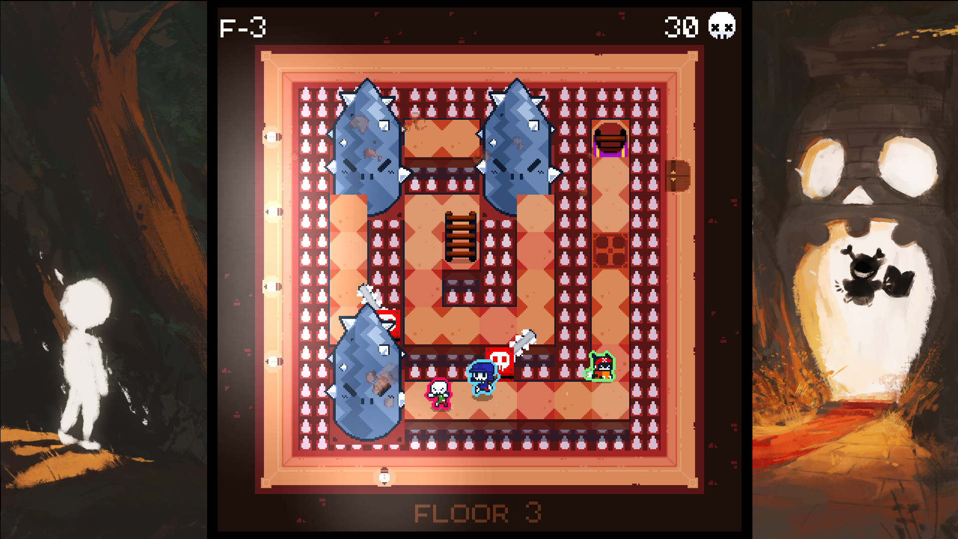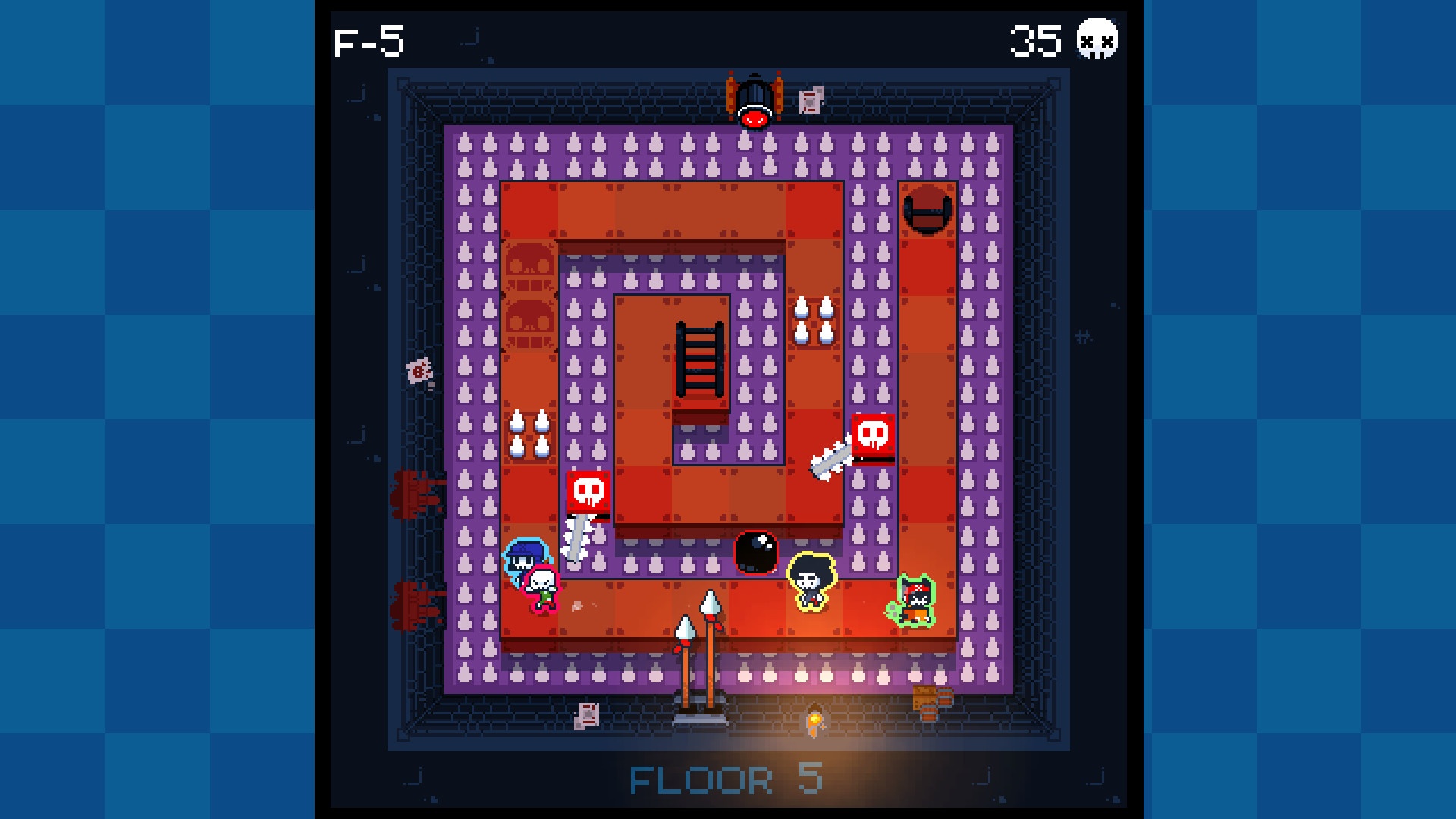 There are three game modes here. The main game mode, versus mode and endless mode. The main mode has you climb through 25 levels split across five areas to reach the end. This can be played solo or co-op. Versus mode is, as far as I know, the same thing except players are competing against each other, this requires at least two players, so I obviously haven’t played it. The final mode is endless, which is what it sounds like. The game just generates level after level for you to run through, and you score is tracked by each tile you walk across. Level generation is pretty good. Each area has its own unique traps (or in some cases just different appearances for other traps), most levels have a few traps that vary from being pretty simple to quite challenging to avoid. If you have to play an area over and over again, you’ll probably end up seeing some similarities, but it’s not too big of an issue.