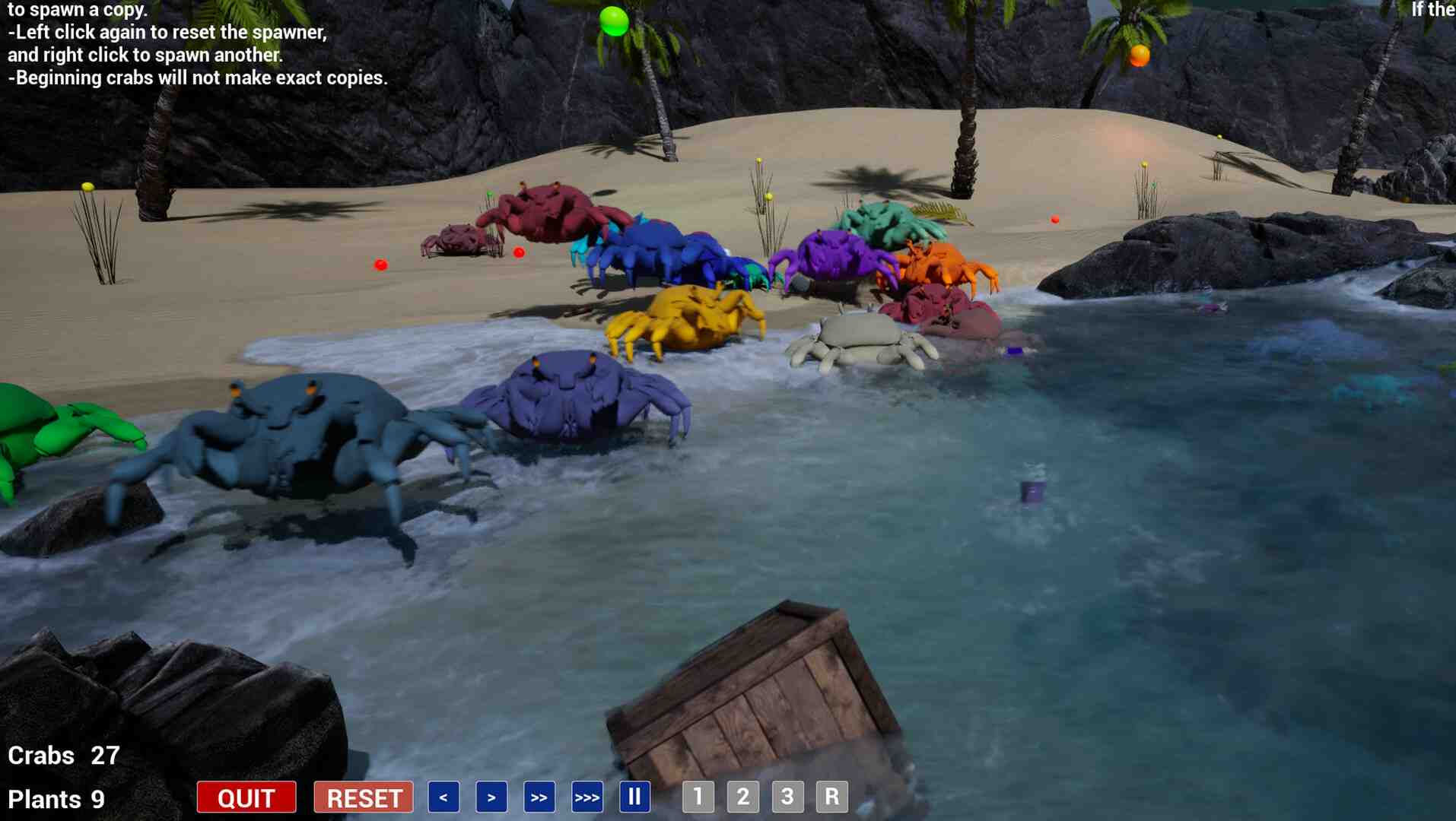 Crabs, in this simulator, are portrayed as simple beings with basic needs – food and space. They roam, eat, and breed in various environments. It’s a calming and meditative experience, providing a soothing escape from the complexities of the real world. The ability to intervene in the lives of these charming creatures. Players can introduce toys and new foods found in crates washed ashore, creating a dynamic and enjoyable experience. Whether guiding them with new treats or enticing them with playful toys, the interactive elements add a layer of enjoyment to the game, making it more than just a passive observation of crab behavior. Witnessing the crabs evolve adds a fascinating dimension to the gameplay. The colors of the crabs signify their adaptive traits, with warmer hues indicating a higher tolerance for heat. These traits are hereditary, passed down to offspring, allowing for an ever-changing and adaptable crab population.