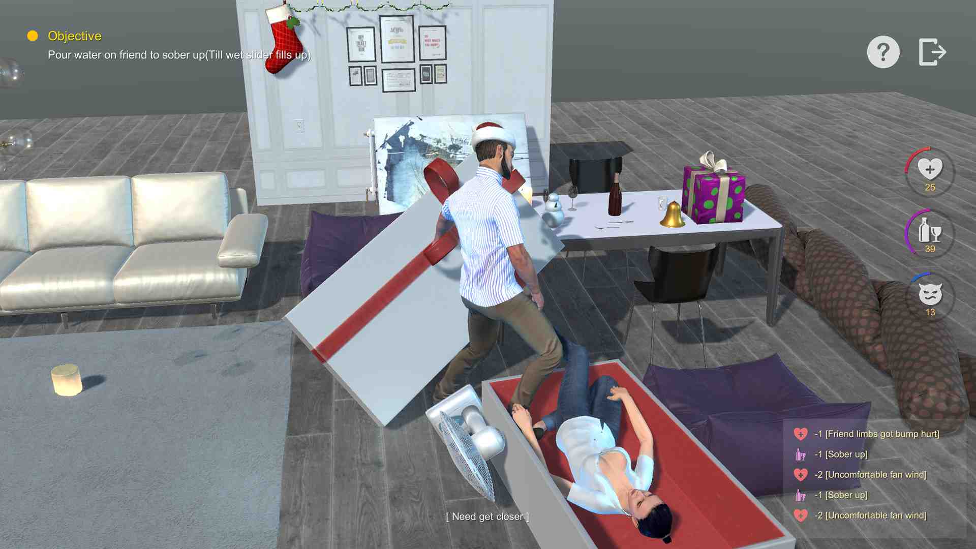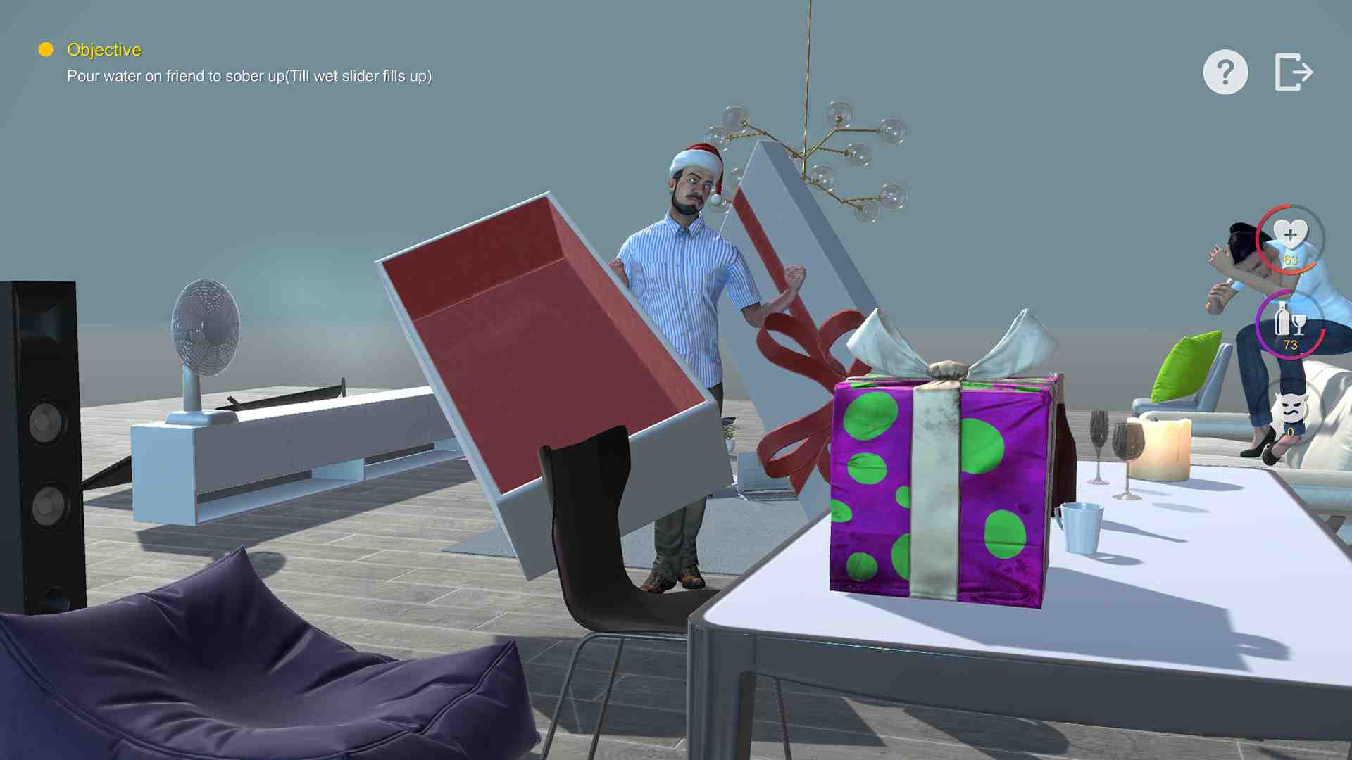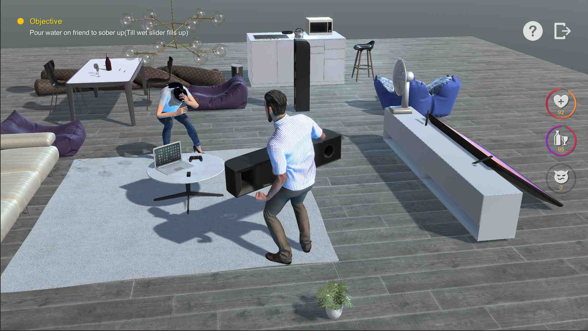 The most funny Sim game this year !!! What will you play if you have a very drunk friend?A warm hearted angel?Or an evil bad guy?You may find answer in this fun sim game. Try exploring in the room and figure out how to sober up your friend,may it’s not only just one solution,though,never hurt your friend,and never do evil! Fun Dynamic Puppet Tech.,characters behave different when target/envirment changes Total random drunk behaviour,you never know what will friend act when you try a move Amazing physics simulation,high end softbody and fluid sim.The wind blow ground to dry,water will wet your body.. You can interact with almost every item,physics sim +puzzle solving We will update more contents regularly Fun,real fun.