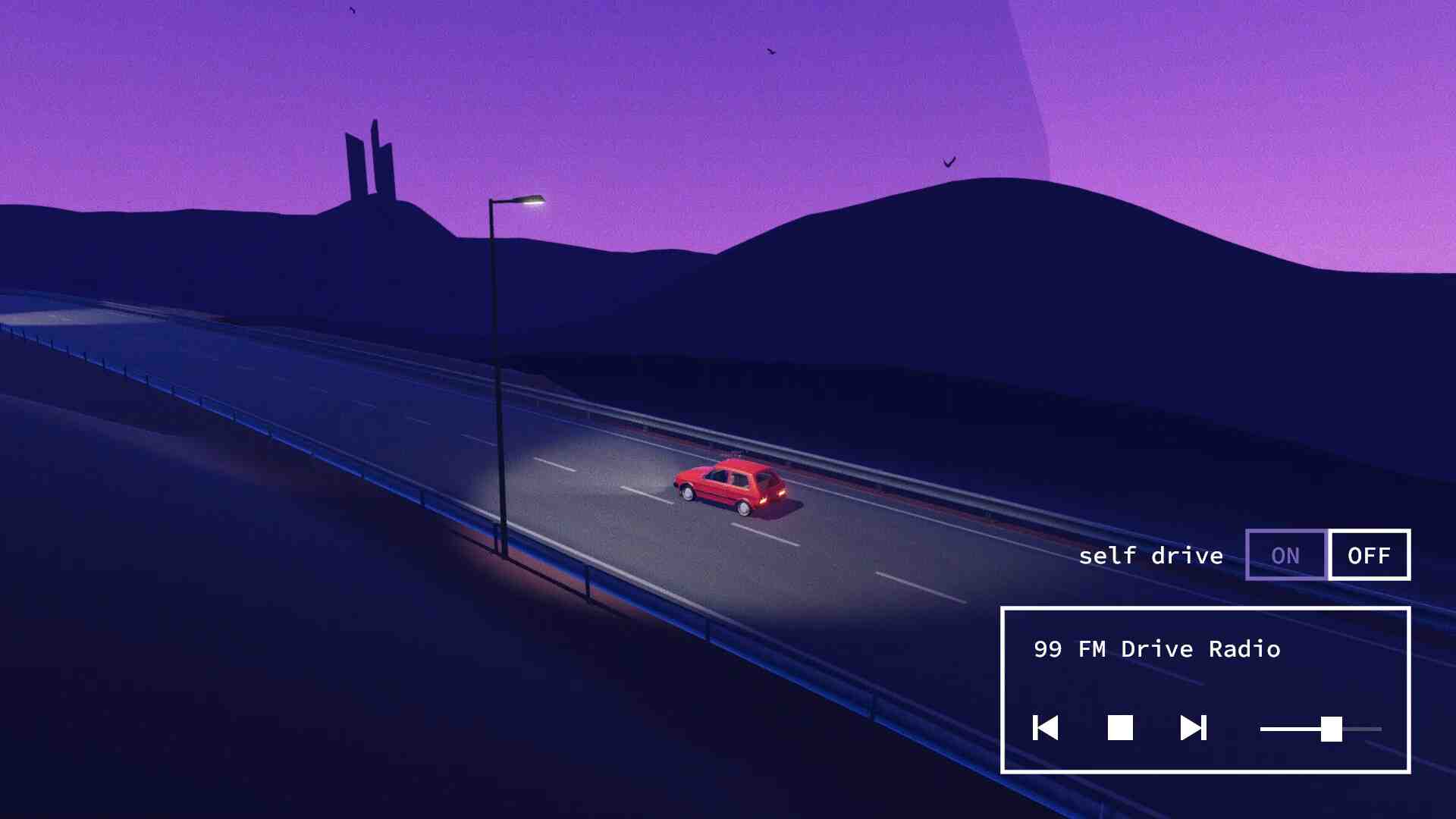 The serpentine roads in the game are inspired by the mountainous roads going from Kosovo to Montenegro. The car is modeled after Yugo, an iconic car produced in Yugoslavia in the 1980s’. The time of the day is reminiscent of dusks in Kosovo, mostly because of the omnipresence of crows and the sounds they make at evening flying back to their nests for the night. Similarly reminiscent of that region are also the monolithic-like objects on top of hills, inspired by Socialist-era Yugoslavian monuments in Kosovo and the rest ex-Yugoslavia. Aside from the significance they have for the area and people there, they have a striking visual appearance that blur the time and place perceptions.